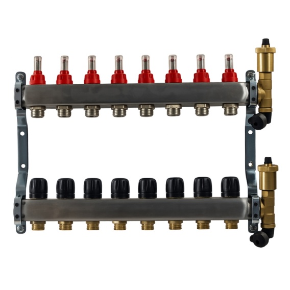 Rozdzielacz zawiera w zestawie uchwyty, zawory odpowietrzająco-spustowe, zawory termostatyczne oraz wskaźniki przepływu.